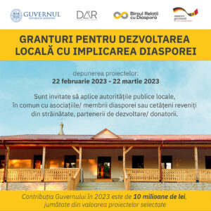 Cancelaria de stat, prin intermediul Biroului Relații cu Diaspora, a lansat o nouă rundă de granturi în cadrul programului guvernamental Diaspora Acasă Reușește „DAR 1+3”. Astfel, autoritățile publice locale de nivelul I sunt invitate să depună dosare de participare la program, în comun cu asociațiile/membrii diasporei, asociațiile de băștinași, grupurile de inițiativă ale cetățenilor stabiliți