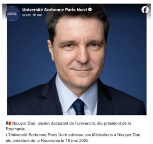 Universitatea Sorbona Paris Nord a transmis un mesaj de felicitare lui Nicușor Dan, noul președinte ales al României, cu ocazia câștigării alegerilor din 18 mai 2025. Într-o postare publicată marți pe Facebook, prestigioasa instituție de învățământ superior din Franța și-a exprimat recunoștința pentru faptul că un fost doctorand al său a ajuns în cea mai