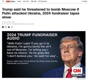 Într-o serie de declarații incendiare făcute în spatele ușilor închise, președintele american Donald Trump a afirmat că l-a amenințat pe Vladimir Putin cu un atac asupra Moscovei, dacă Rusia ar fi îndrăznit să invadeze Ucraina. Afirmațiile au fost făcute în cadrul unei strângeri de fonduri pentru campania sa din 2024 și sunt documentate într-o înregistrare audio